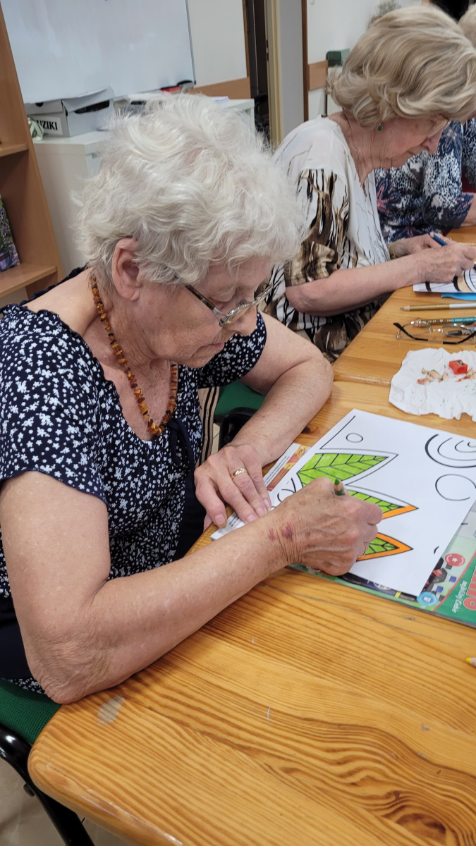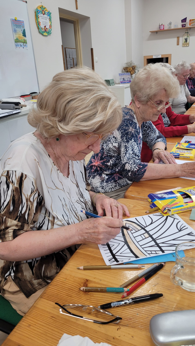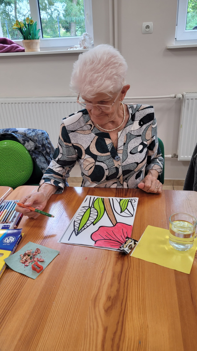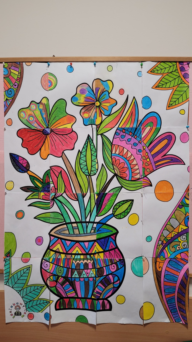 Seniorzy wspólnie stworzyli ogromną Kolorowankę XXL – obraz kwiatów w wazonie. To nie tylko artystyczne wyzwanie, ale też przykład indywidualnej kreatywności – każdy dodał coś od siebie, a efekt końcowy zachwyca. Ogromny obraz kwiatów w wazonie, który powstał z pracy wielu rąk, stał się symbolem współpracy i wspólnej radości tworzenia.