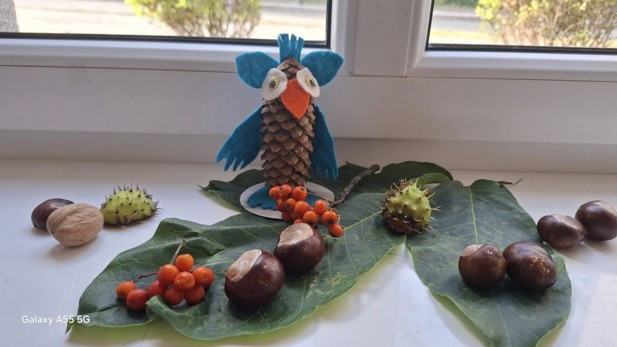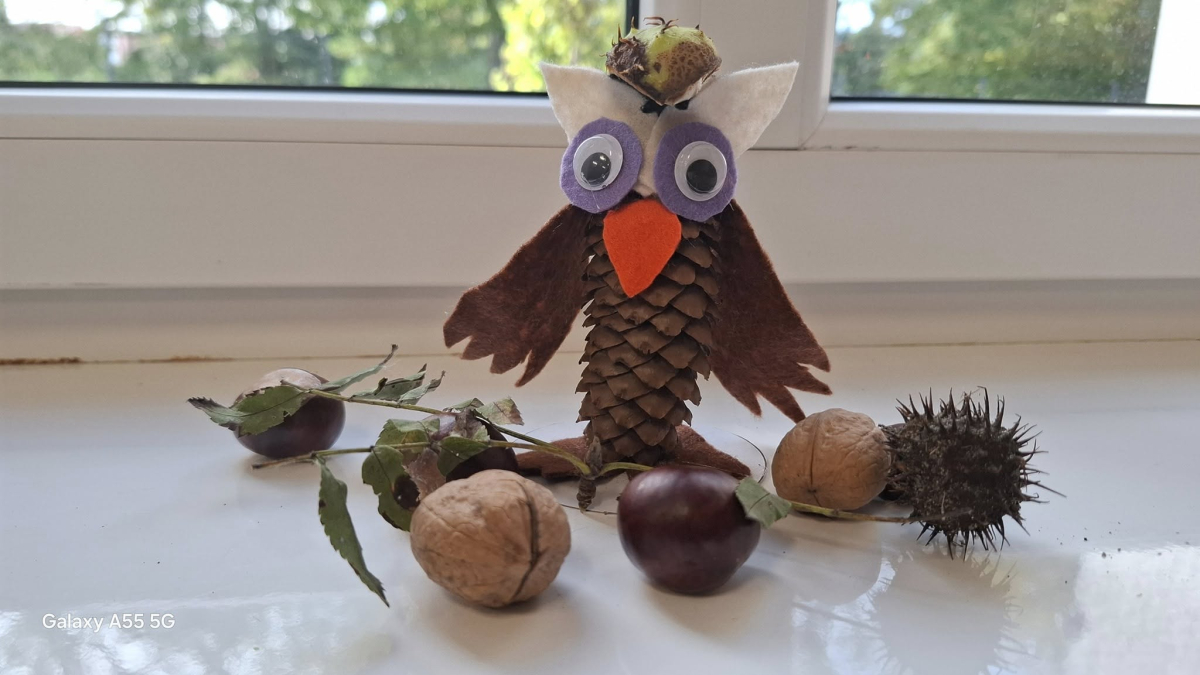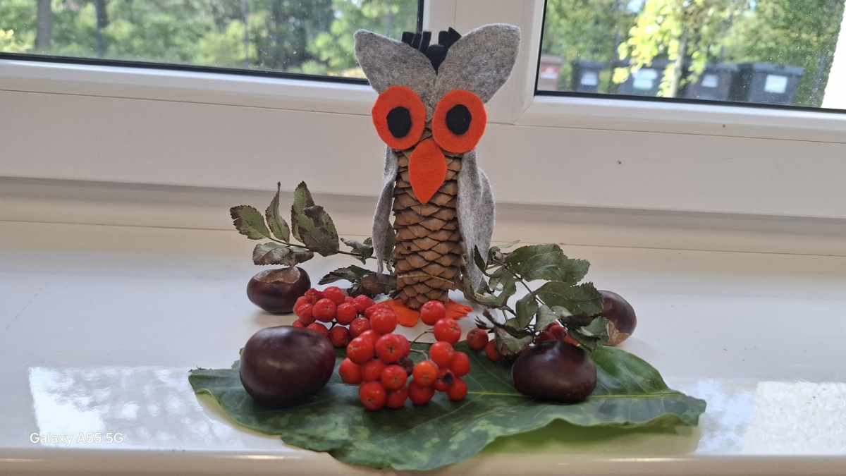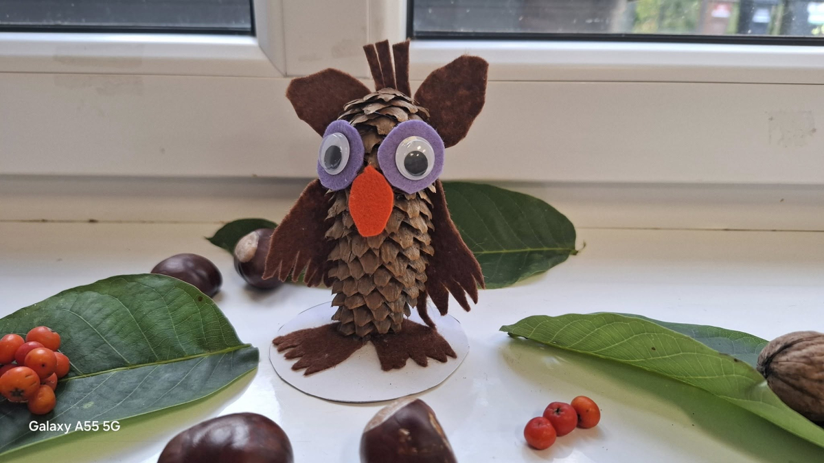 Podczas zajęć kreatywnych powstawały jesienne dekoracje: sowy z szyszek i filcu, szyte skrzaty oraz hotelik dla owadów. Było to twórcze i pełne zaangażowania spotkanie.