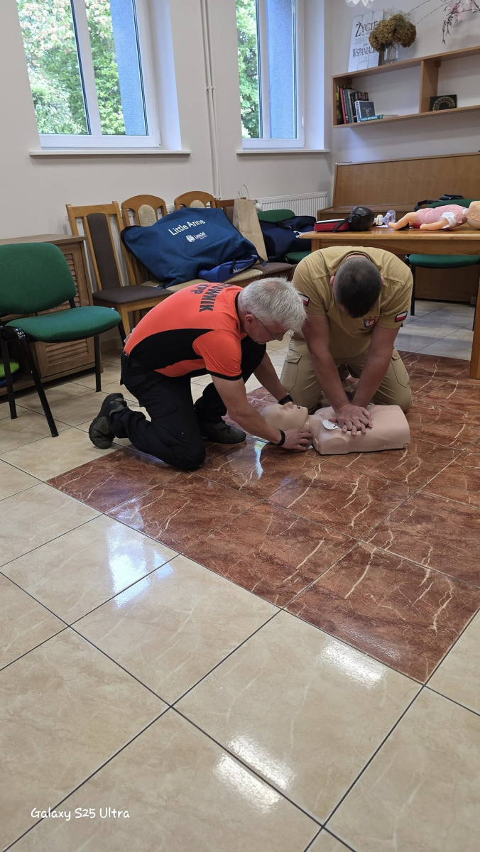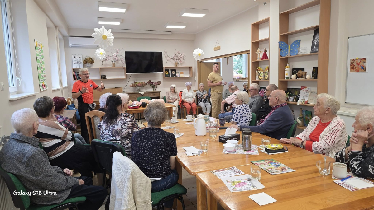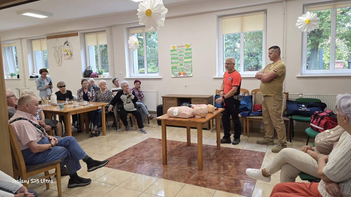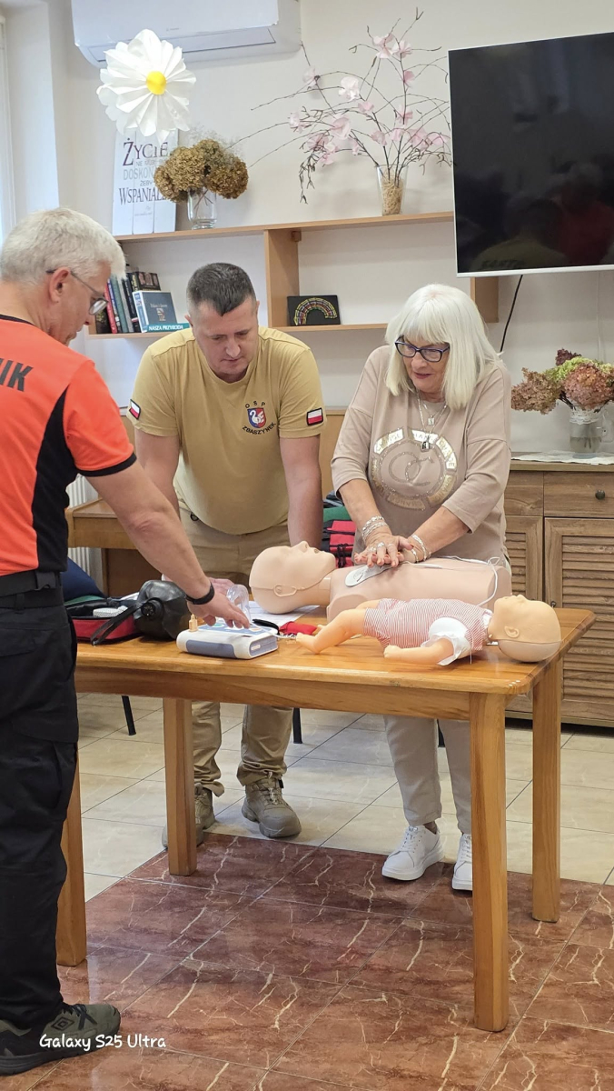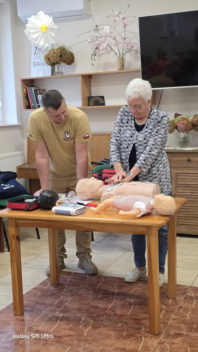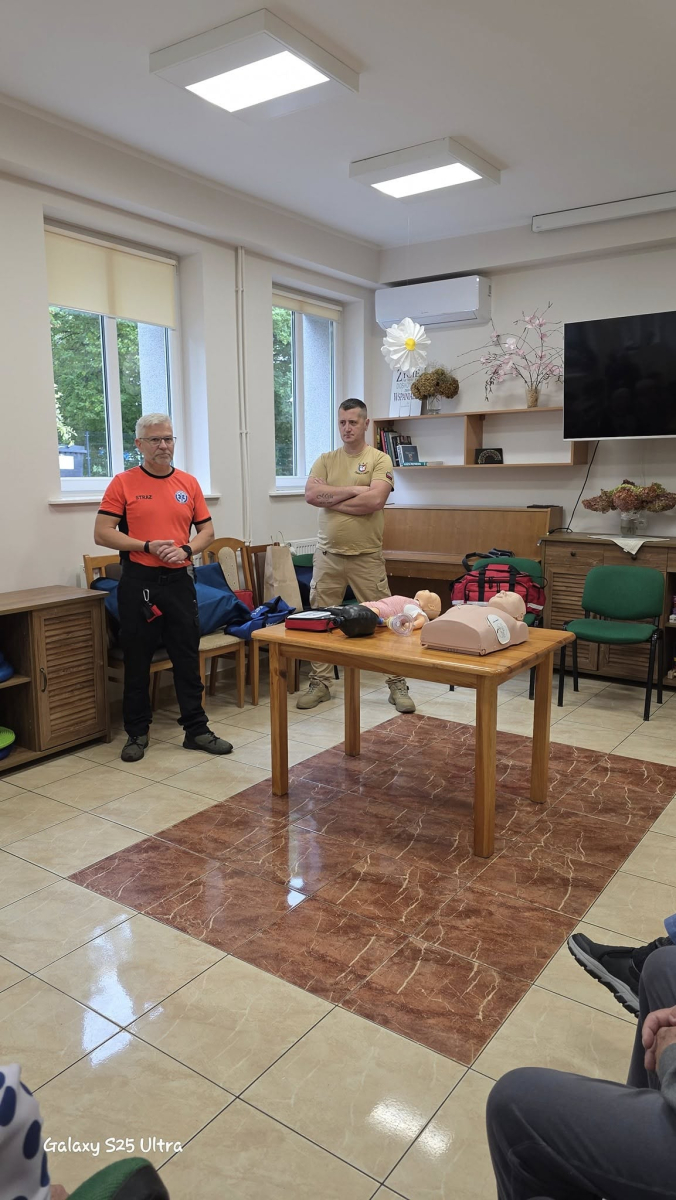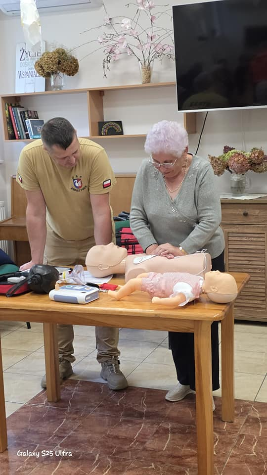 Seniorów odwiedzili wyjątkowi goście – strażak Robert i strażak Radosław. Podczas spotkania przeprowadzili szkolenie z podstaw pierwszej pomocy. Seniorzy dowiedzieli się, jak reagować w sytuacjach zagrożenia życia, w jaki sposób prawidłowo wezwać pomoc oraz jakie działania mogą uratować życie. Była to cenna lekcja, która zwiększa poczucie bezpieczeństwa.