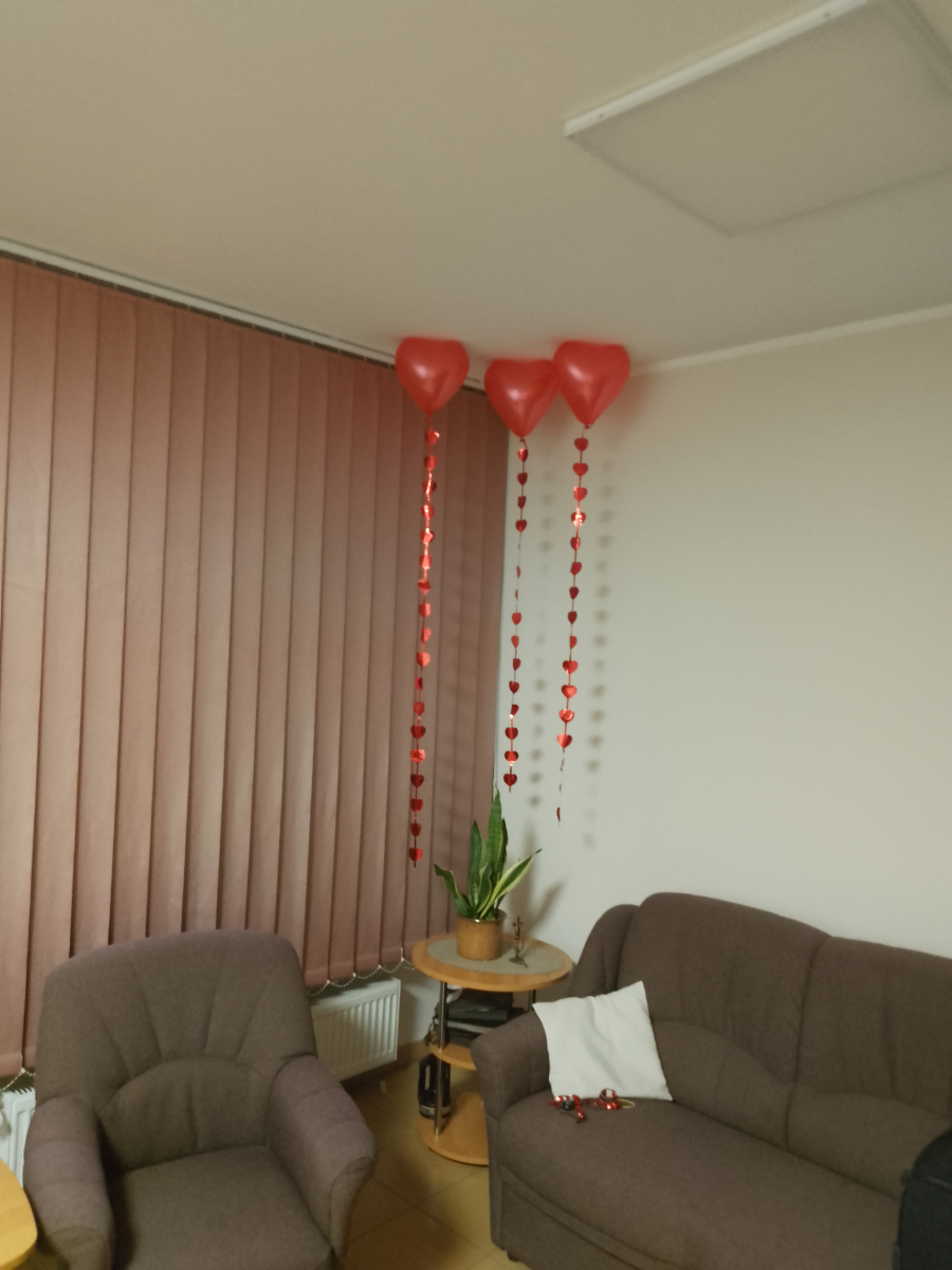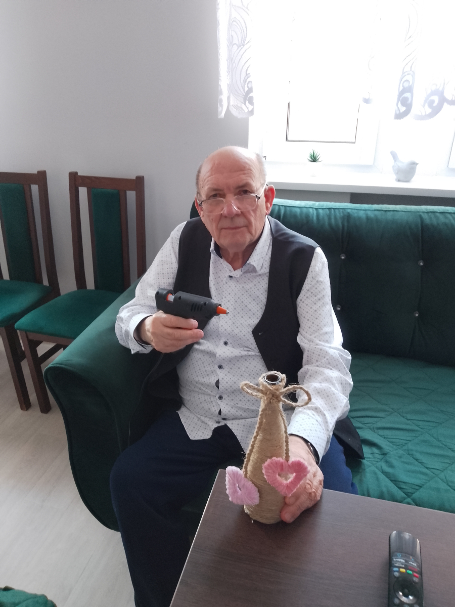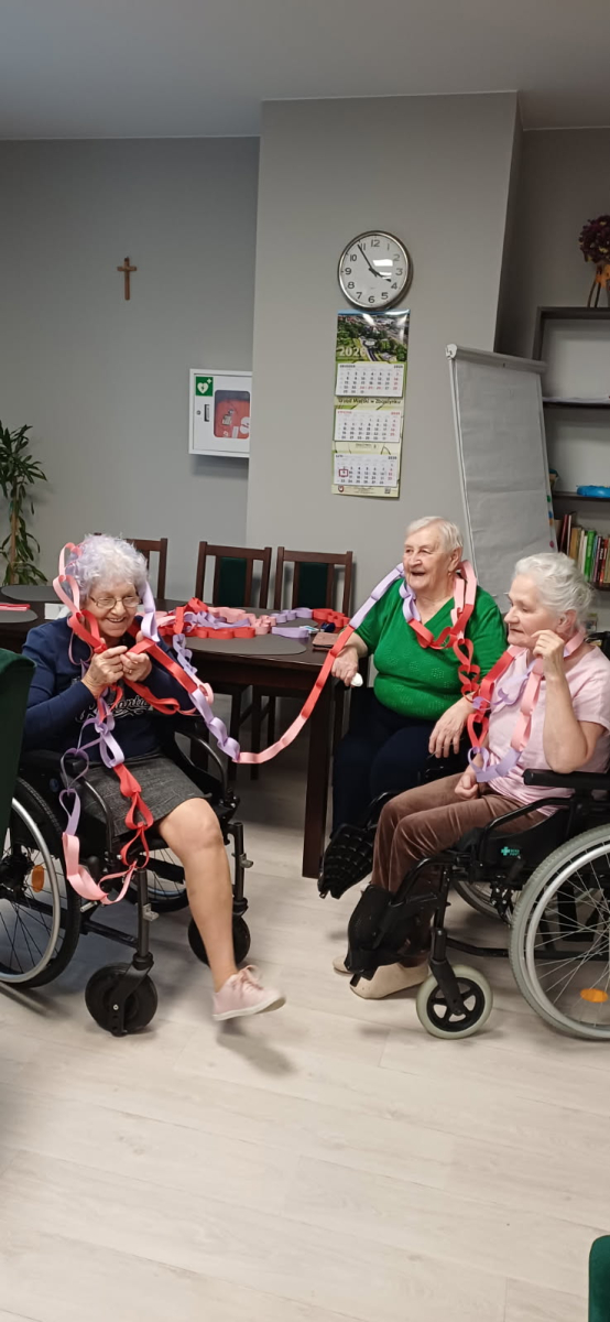 Mieszkańcy Mieszkań Wspomaganych z zaangażowaniem przygotowali wystrój na jutrzejszy dzień - powstaje kolorowy łańcuch serduszek oraz pięknie ozdobiony wazon.