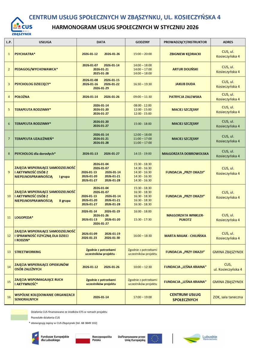 Zapraszamy do zapoznania się z harmonogramem usług realizowanych przez Centrum Usług Społecznych w Zbąszynku w miesiącu styczniu 2026r.