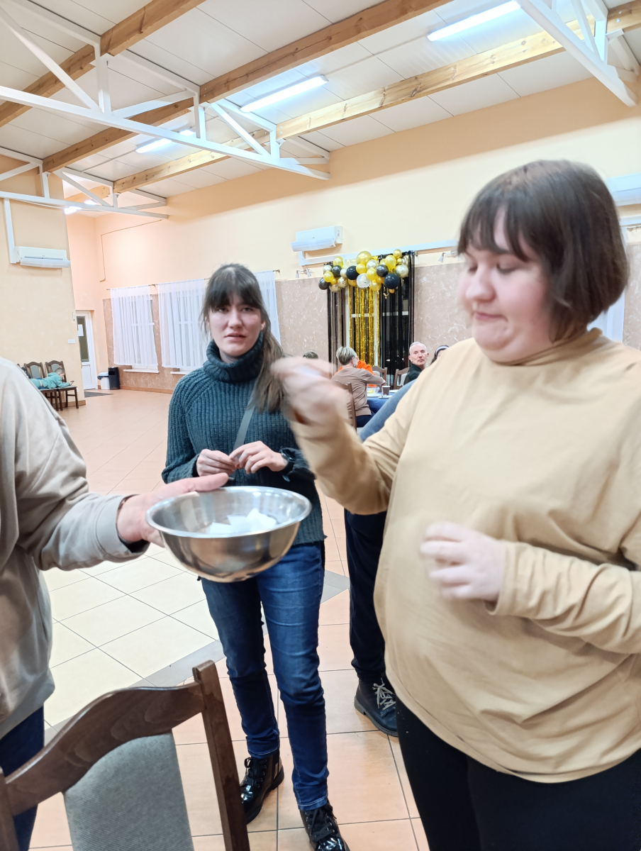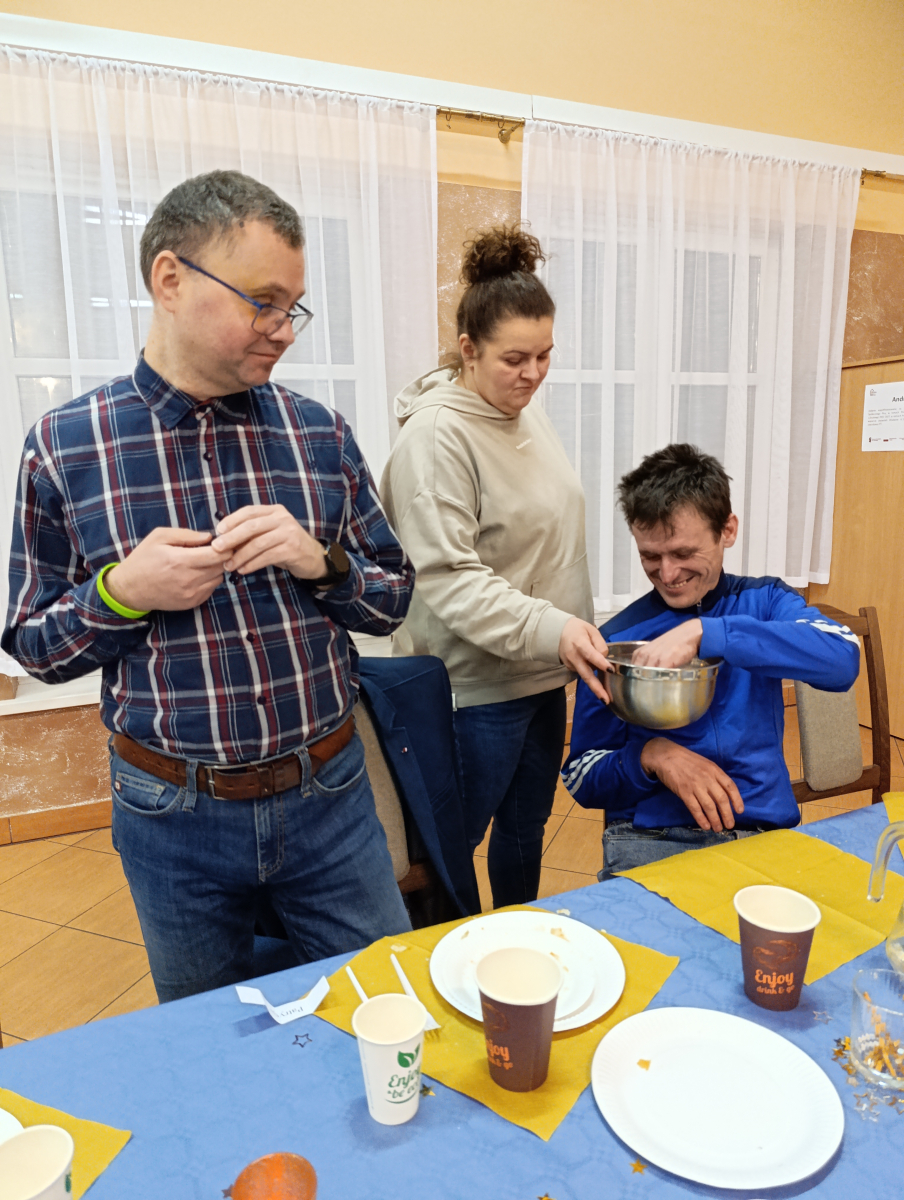 Parkiet szybko zapełnił się tańczącymi uczestnikami, a starannie dobrana muzyka zachęcała do aktywnego udziału w zabawie. Organizatorzy zadbali o to, aby każdy mógł w pełni korzystać z przygotowanych atrakcji — a tych było naprawdę wiele. Nie zabrakło również akcentów andrzejkowych, tak ważnych dla charakteru tego święta. Wróżby, zabawy i symboliczne przepowiednie wywoływały wiele emocji, uśmiechu i pozytywnego napięcia, dodając wydarzeniu wyjątkowego, magicznego klimatu. Wyjątkowe dania przygotowane przez Koło Gospodyń Wiejskich z Dąbrówki Wielkopolskiej podbiły serca uczestników. Aromatyczne, domowe potrawy tworzyły niepowtarzalną atmosferę wspólnego biesiadowania i były doskonałym uzupełnieniem tego pełnego wrażeń spotkania. Zabawa Andrzejkowa stała się nie tylko okazją do wspólnej rozrywki, ale również momentem budowania relacji, wzmacniania poczucia wspólnoty i wzajemnego wsparcia. Wydarzenie pokazało, jak ważne są działania integracyjne dla osób z niepełnosprawnościami – niosące radość, wytchnienie i poczucie przynależności. Wydarzenie odbyło się w ramach projektu