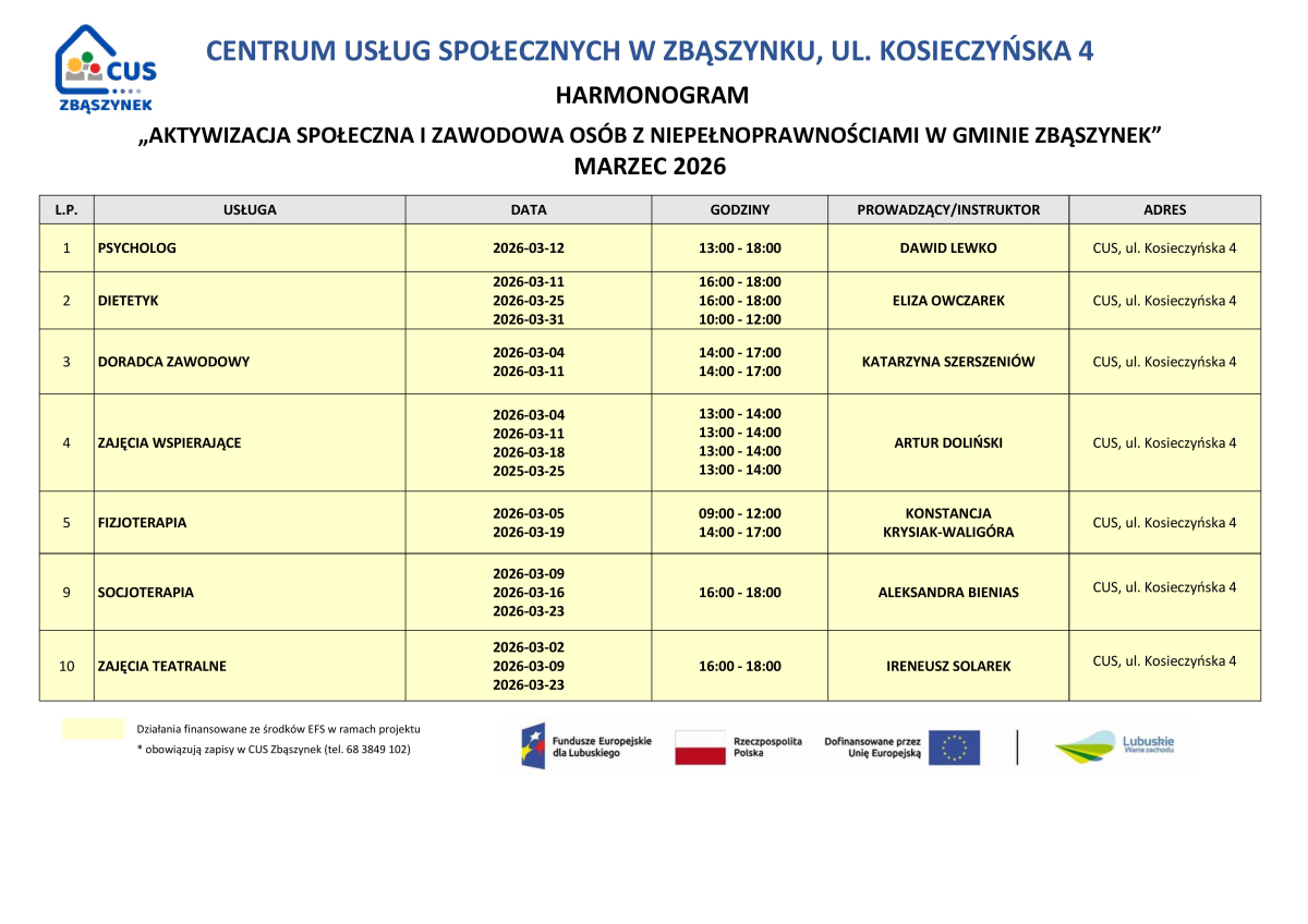 Zapraszamy do zapoznania się z harmonogramem działań w miesiącu marcu2026r. projektu pn. "Aktywizacja społeczna i zawodowa osób z niepełnosprawnościami w Gminie Zbąszynek" nr umowy FELB.06.16-IZ.00-0004/25-00 współfinansowany z Europejskiego Funduszu Społecznego Plus w ramach Programu Fundusze Europejskie dla Lubuskiego 2021-2027, w ramach Priorytetu 6. Fundusze Europejskie na wsparcie obywateli Działania 6.16 Aktywna integracja społeczno-zawodowa - IIT"