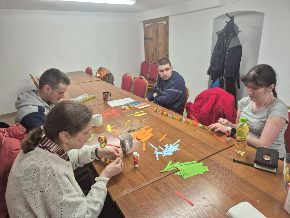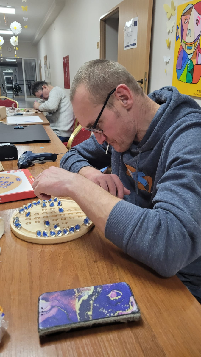 - 10.12.2025 na zajęciach tego dnia trwały dalsze przygotowania świąteczne, tworzono stroiki bożonarodzeniowe, które niedługo ozdobią stoły podczas kolacji wigilijnej. Każdy stroik jest wyjątkowy. Część kończyła postacie mikołajkowe na choinkę ze splotów makramowych, a pozostali wykonywali zimowe domki z papieru. Podświetlone okienka będą się pięknie prezentowały wieczorną porą.