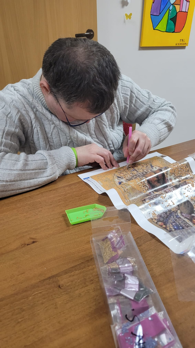 Mariusz kolorował świąteczny obrazek, a Marcin kończył kartkę bożonarodzeniową wykonaną haftem diamentowym.