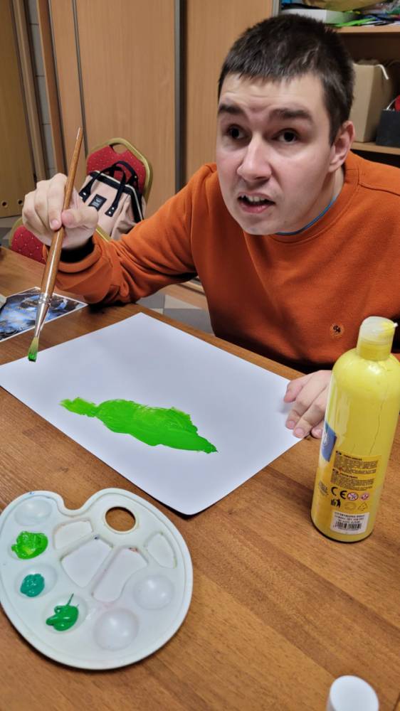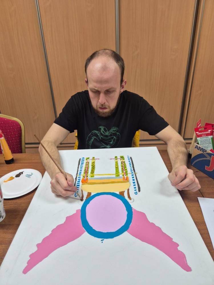 Tymoteusz kontynuował malowanie obrazu przedstawiającego „krzesło tolerancji”, które symbolizuje realizowany projekt grupy. Krzysztof z kolei z dumą zaprezentował ukończony haft diamentowy — pięknego kota, nad którym pracował przez wiele tygodni, wykazując się ogromną cierpliwością.