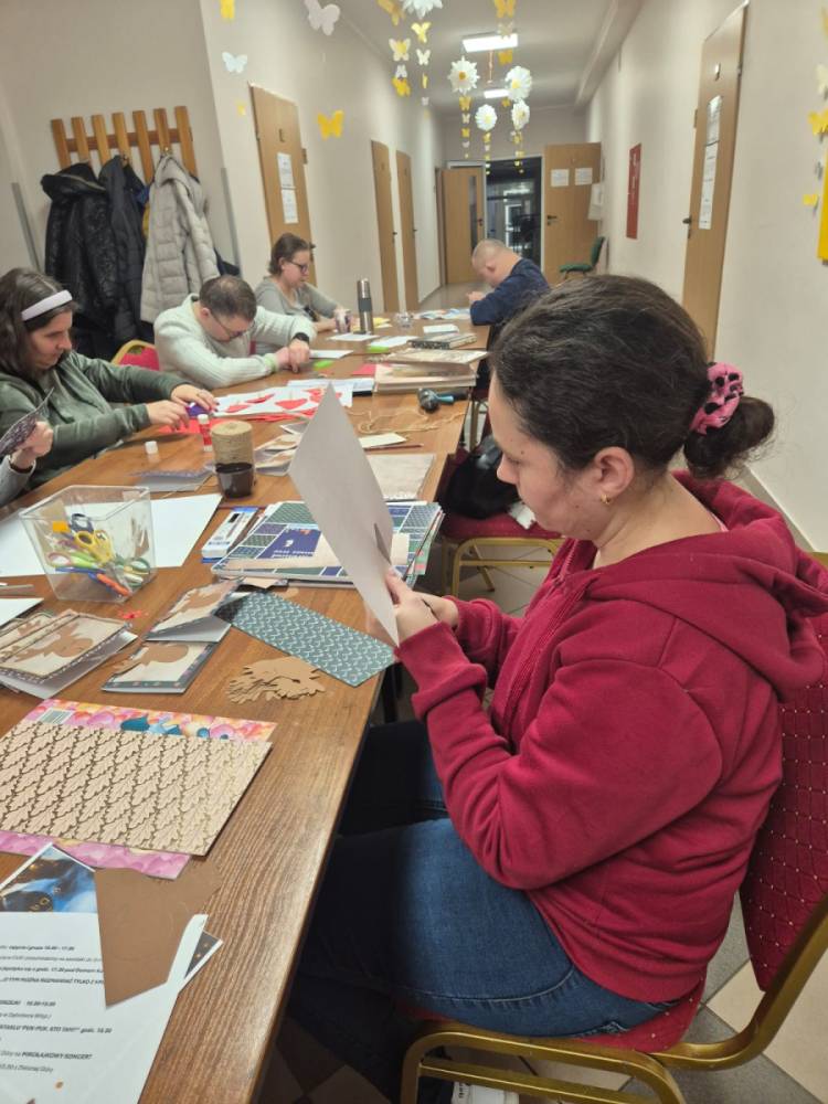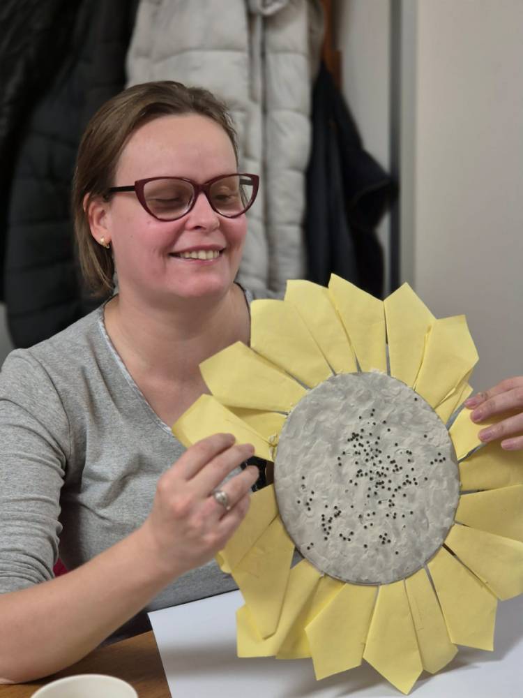 Podczas zajęć wspomagających samodzielność i aktywność osób z niepełnosprawnościami, które odbyły się 18.11.2025 ukończono papierowe girlandy z muchomorami. Trójwymiarowy słonecznik wykonany przez Milenę również nabrał ostatecznego kształtu i prezentuje się imponująco.