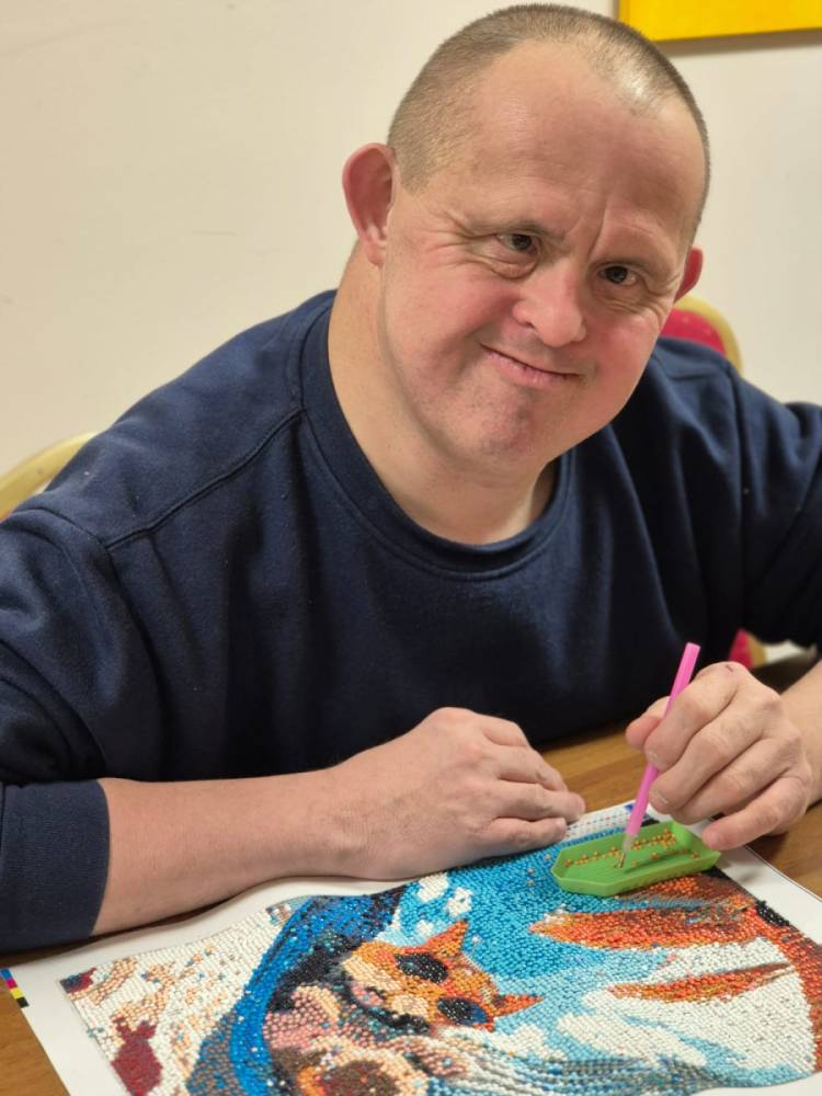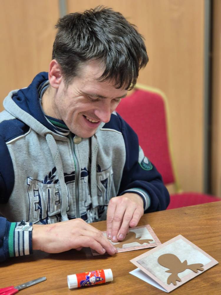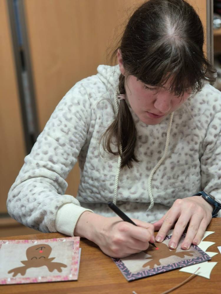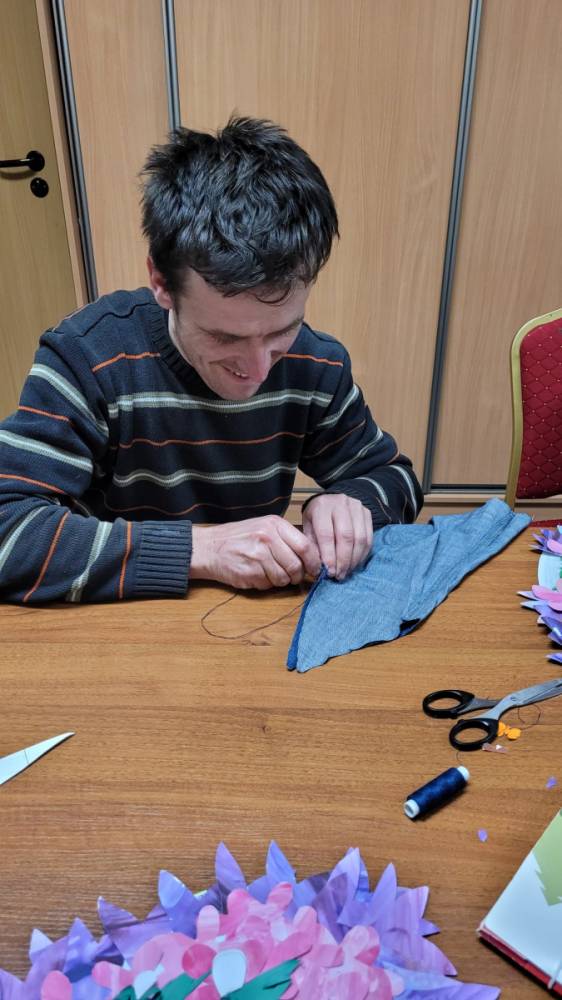 W dniu 19.11.2025 kończono prace związane z krasnalami - ulubionym motywem Marcina, który tym razem chwycił za igłę i nitkę, tworząc kolejne elementy swojej pracy. Kontynuowano również przygotowanie kartek świątecznych.