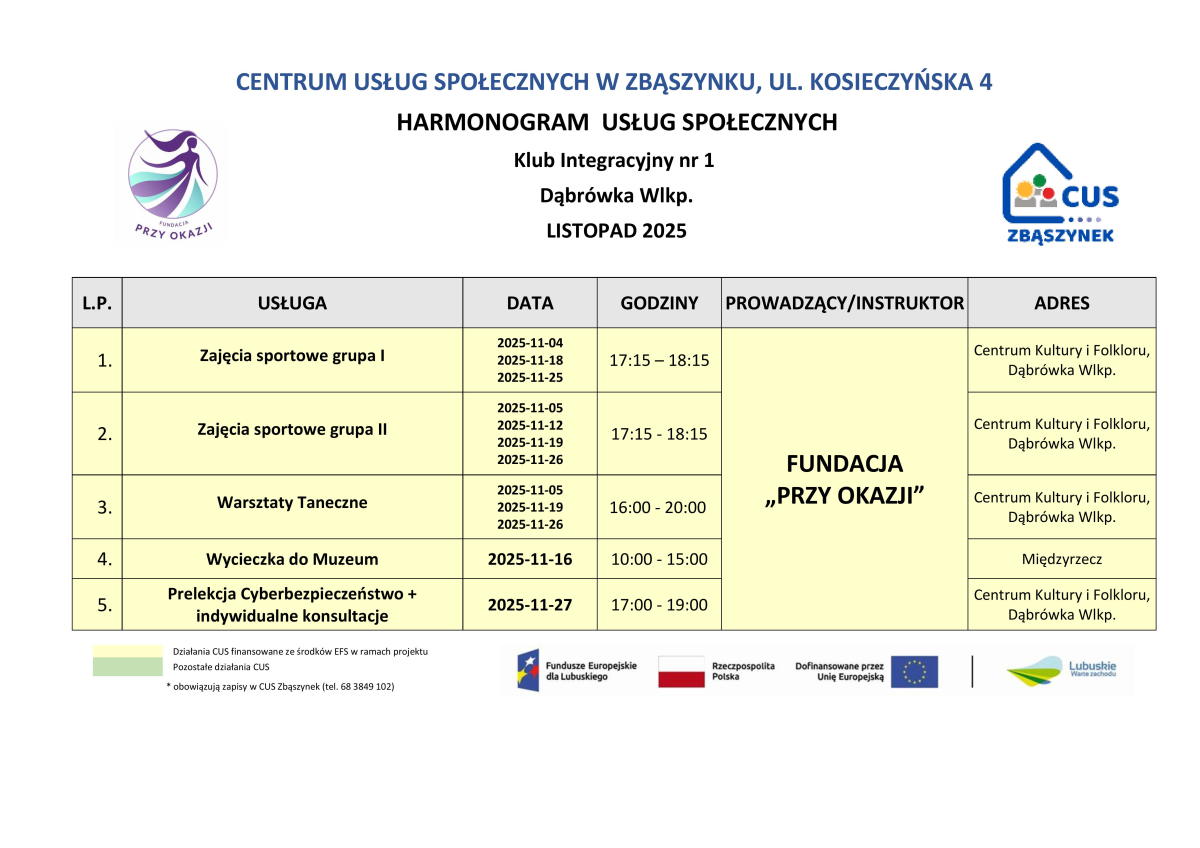 Zapraszamy do zapoznania się z harmonogramem usług realizowanych przez Centrum Usług Społecznych w Zbąszynku w miesiącu listopadzie 2025r. dla Klubu Integracyjnego nr 1.
