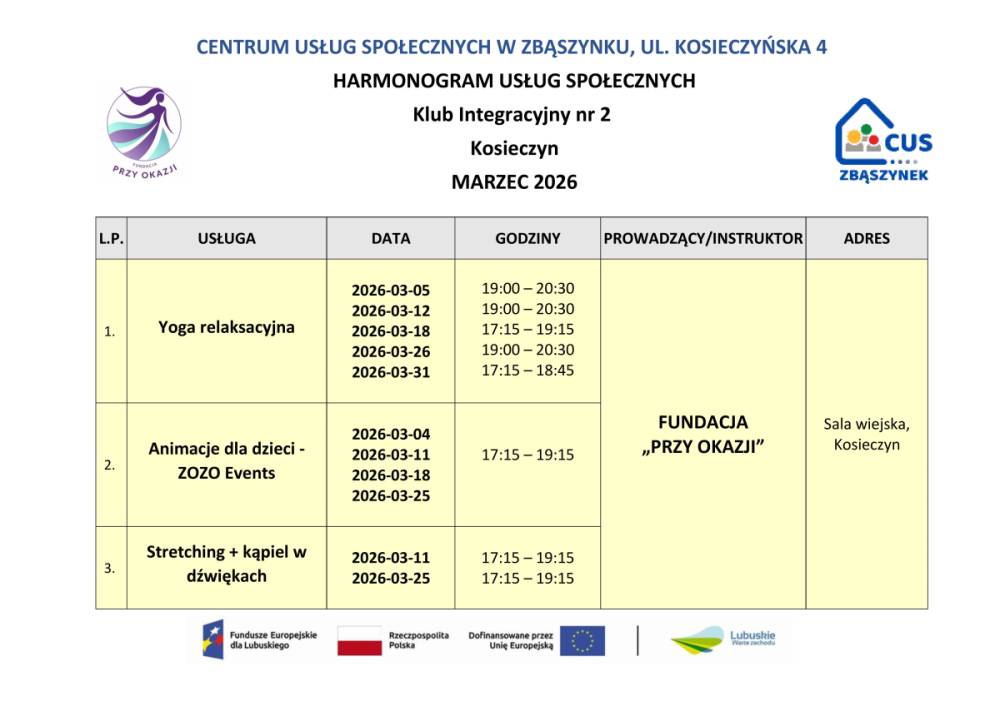 Zapraszamy do zapoznania się z harmonogramem usług realizowanych przez Centrum Usług Społecznych w Zbąszynku w miesiącu marcu 2026r. dla Klubu Integracyjnego nr 2.
