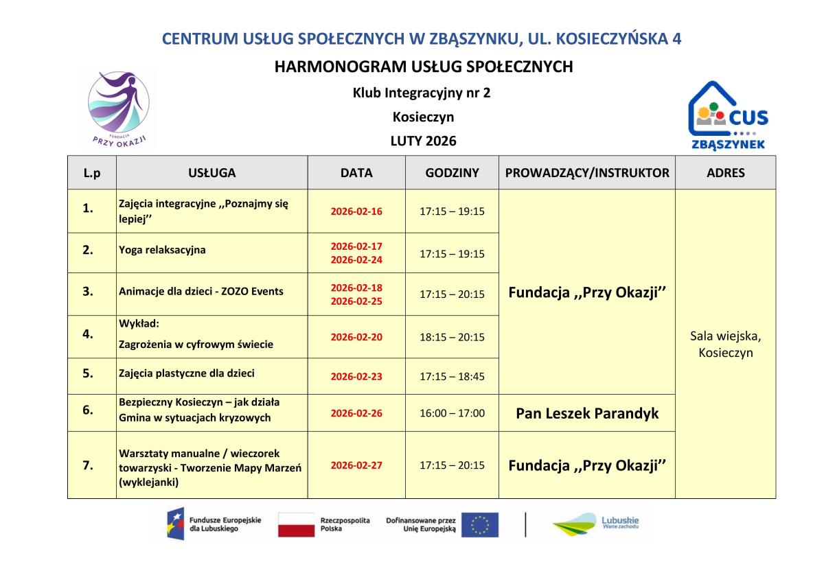 Zachęcamy do zapoznania się z harmonogramem Klubu Integracyjnego nr 2 w Kosieczynie.