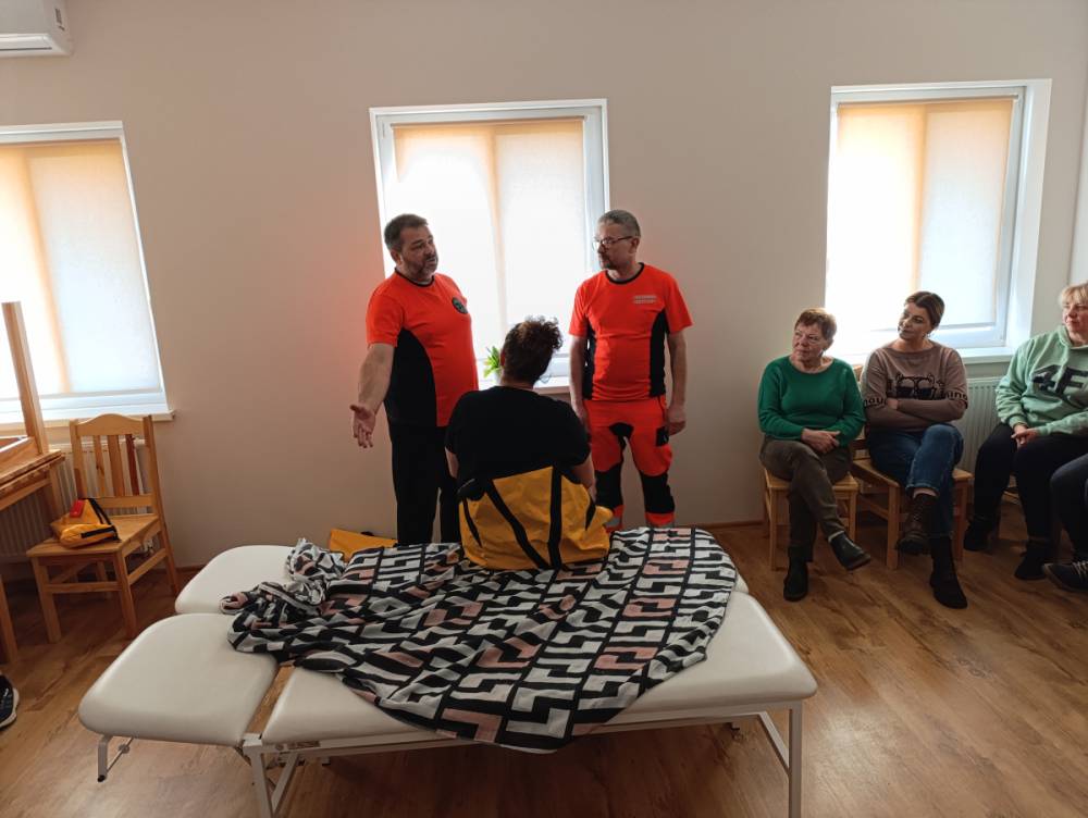 W trakcie spotkania prowadzący zaprezentowali również specjalistyczny sprzęt pomocny w opiece - miękkie krzesełko transportowe oraz nosze płachtowe ułatwiające przenoszenie osoby zależnej.