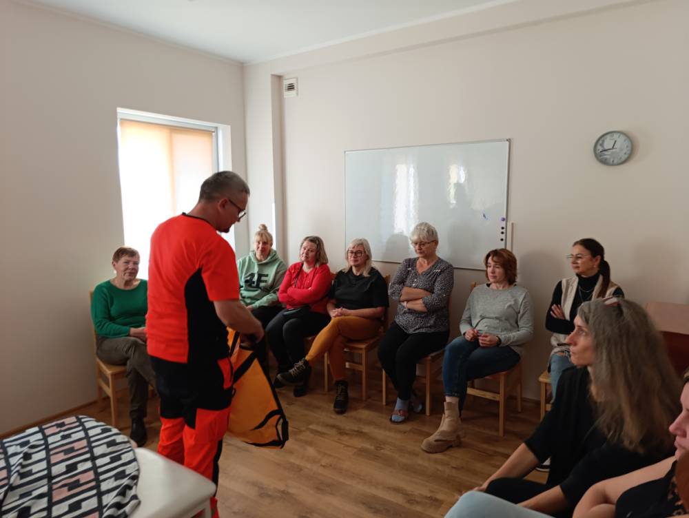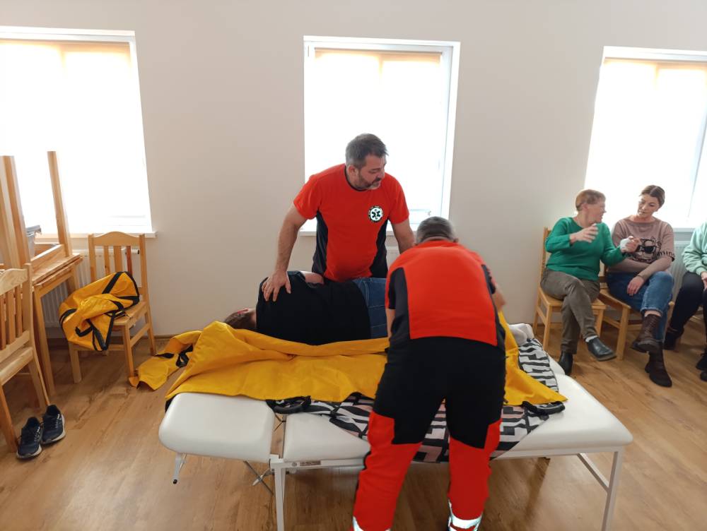 Podczas zajęć ratownicy medyczni w praktyczny sposób pokazali, jak właściwie postępować z osobą leżącą – jak dbać o jej pielęgnację i higienę, a także jak bezpiecznie podnosić, sadzać i przemieszczać podopiecznego, by nie narazić na urazy ani siebie, ani osoby chorej.