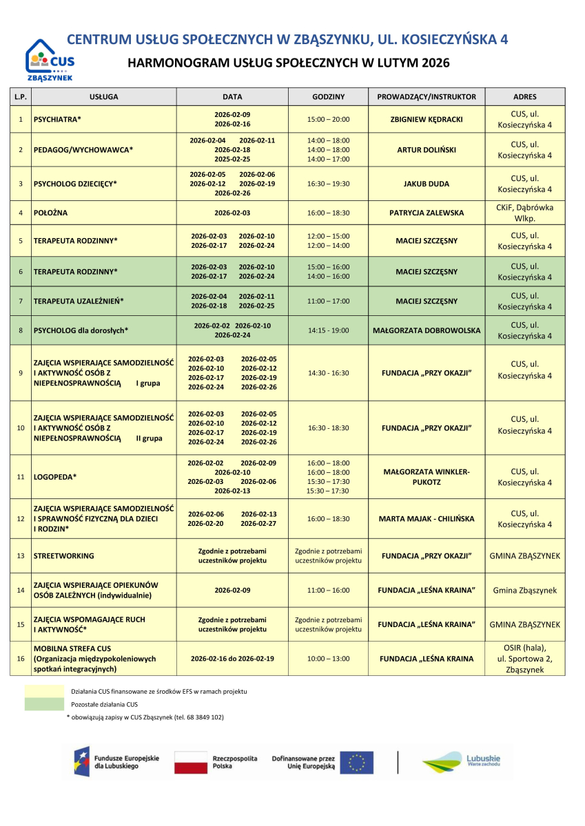 Zapraszamy do zapoznania się z harmonogramem usług realizowanych przez Centrum Usług Społecznych w Zbąszynku w miesiącu lutym 2026r.