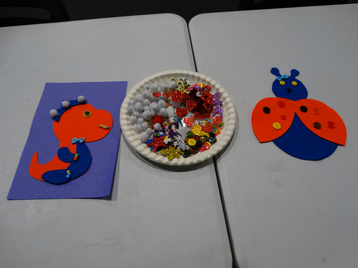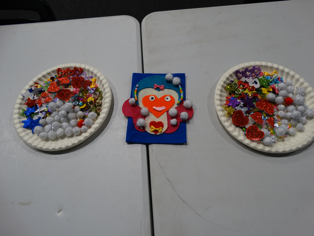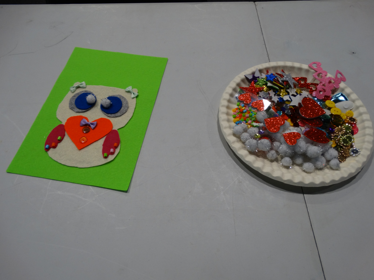 - kolorowanki i mnóstwo materiałów plastycznych – brokatowe naklejki, kolorowe pomponiki i koraliki… wszystko poszło w ruch!