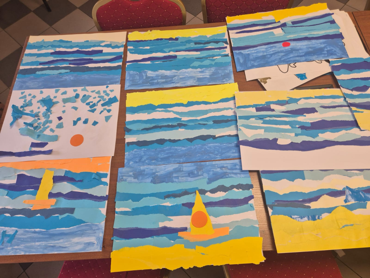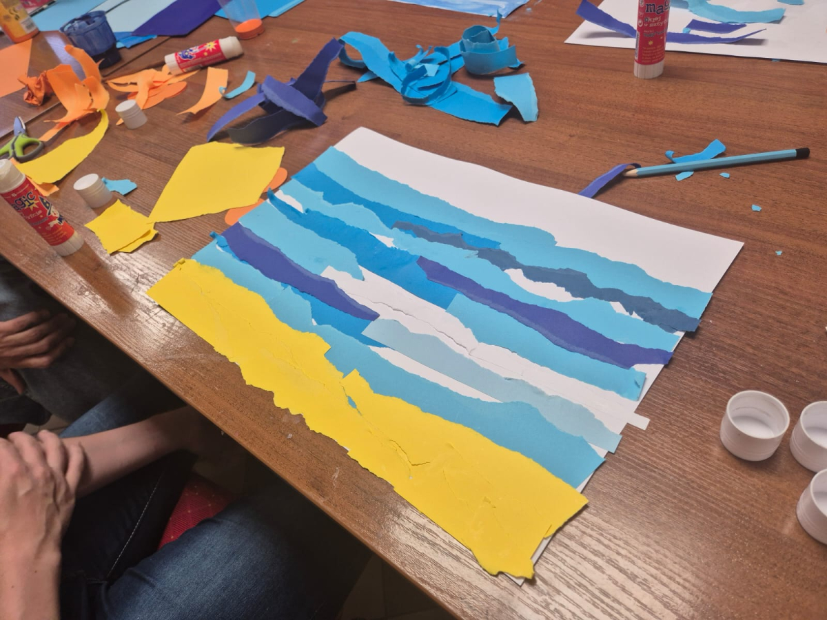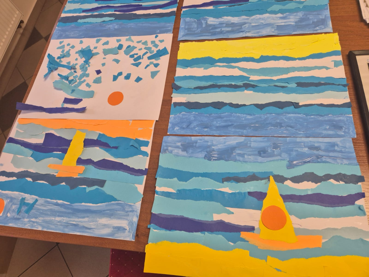 02.09.2025 rozmawiano o letnich przygodach, powstały wydzieranki z nadmorskim krajobrazem.