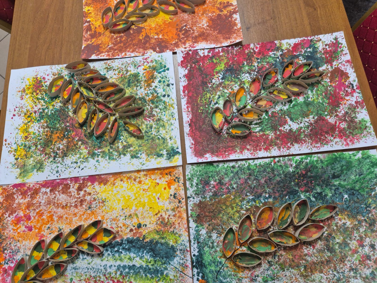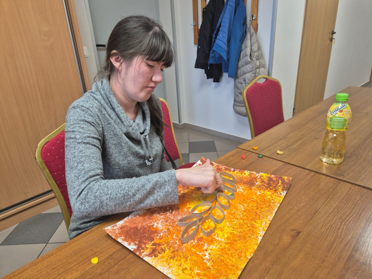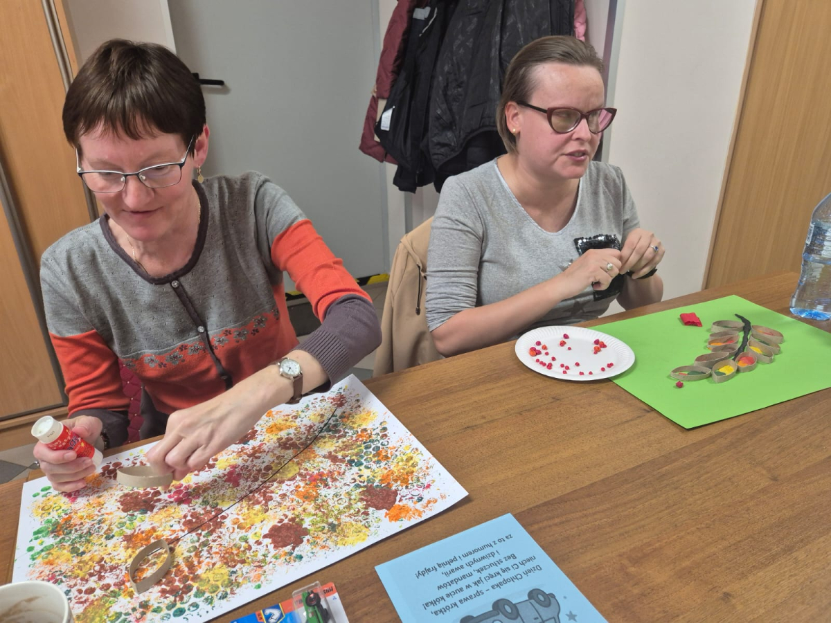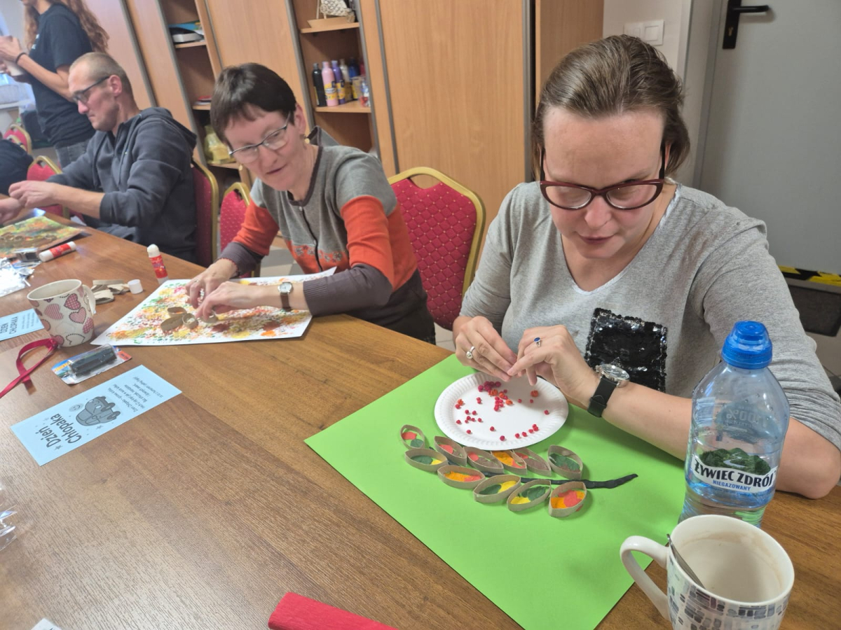 Podczas zajęć kontynuowano rozpoczęte wcześniej prace plastyczne. Jarzębinowe liście wypełniane były plasteliną w barwach jesieni, a Milena z ogromną precyzją tworzyła czerwone owoce z krepiny. Nie zabrakło też chwili na wspólne rozmowy i kubek ciepłej herbaty.